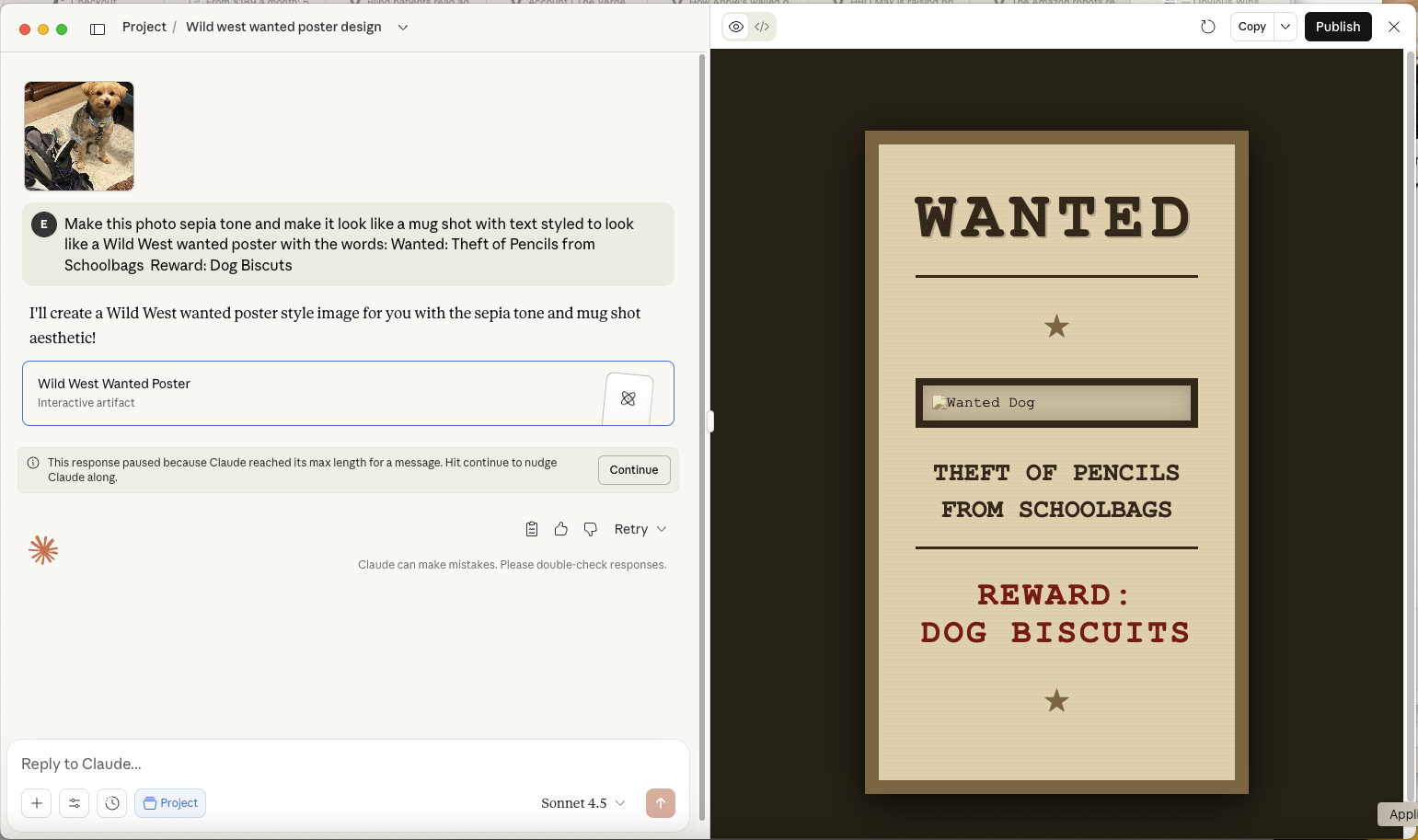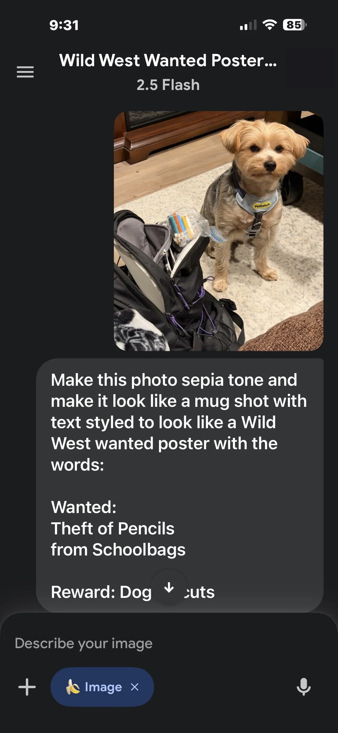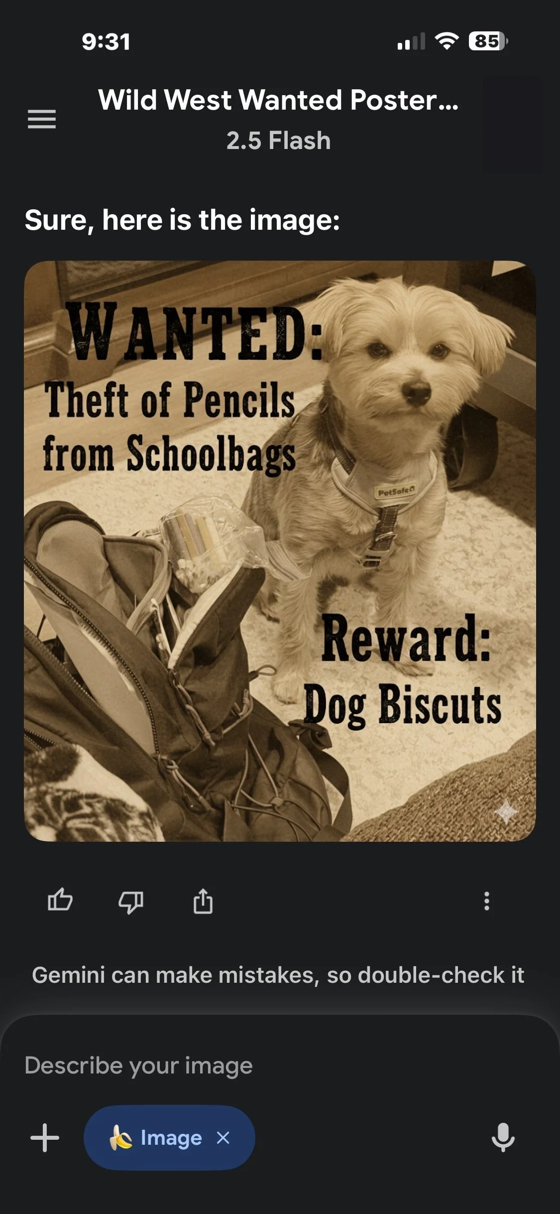 Google Gemini’s output was delivered much faster than ChatGPT, but is clearly a lower quality than the design ChatGPT offered. The layout doesn’t match an American 19th century Wild West Wanted poster design at all, but it’s interesting that both referenced old slab serif or wood type fonts of the era.
